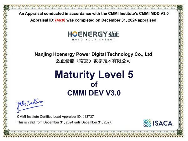 交付的底气,源于弘正深耕数字化储能赛道的长期积累。据悉,弘正储能(南京)数字技术有限公司已正式通过全球软件领域“天花板”认证——CMMI-DEV 3.0 5级,标志着企业在软件研发、服务交付的标准化、成熟度上达到国际先进水平。
