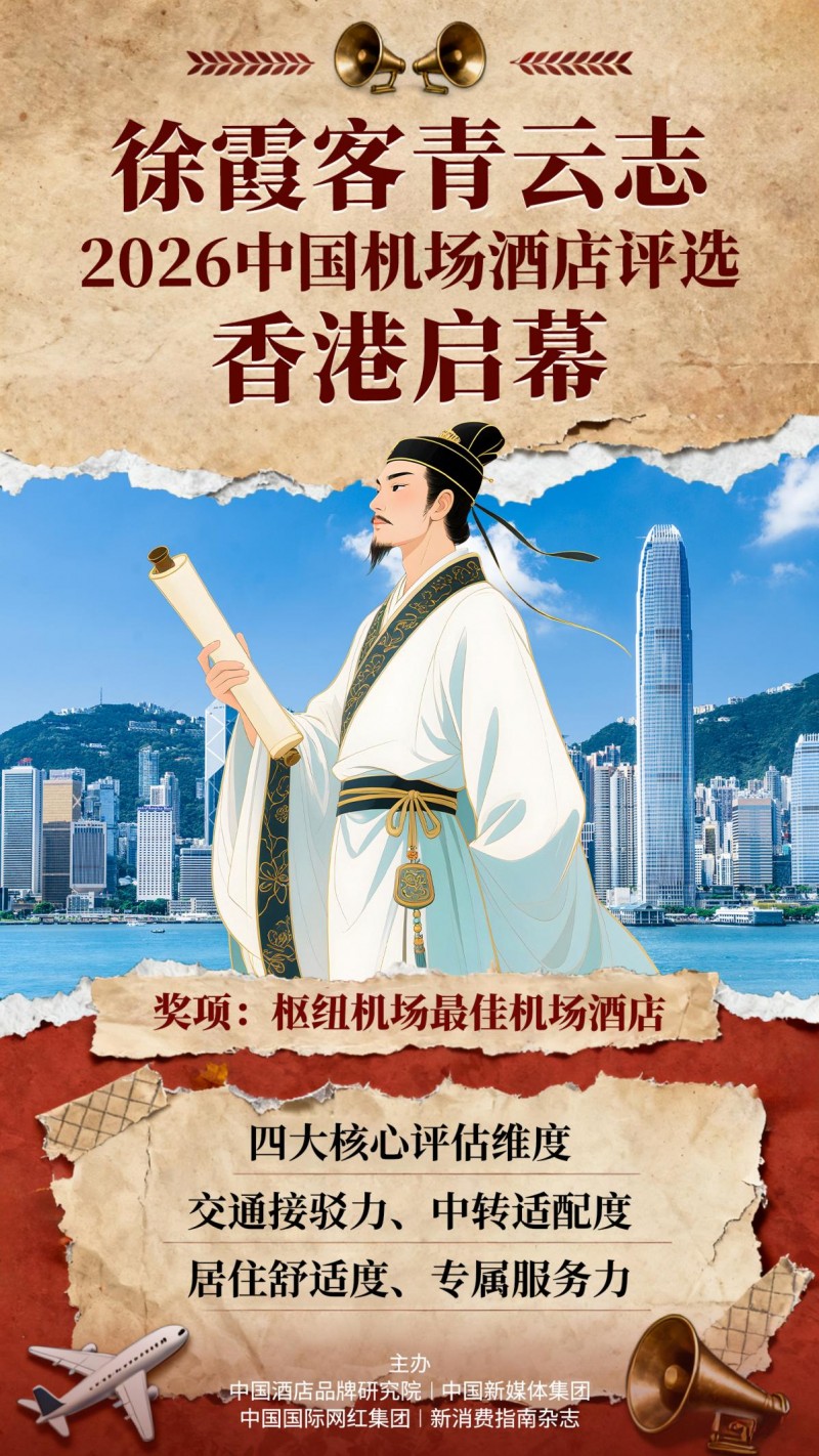 当徐霞客“探索天地”的旅行精神跨越六百年,与当代航空出行者“求便捷衔接、享高效舒适栖居”的核心需求共振,一场重新定义机场住宿标准的行业盛会,近日在“亚洲文旅枢纽”香港正式启动。“徐霞客青云志——2026中国机场酒店评选”作为中国文旅卓越大奖核心板块,由中国酒店品牌研究院、中国新媒体集团、中国国际网红集团、新消费指南等四大权威机构联合主办、上海秀维文化传媒全程承办,11月15日至12月15日为评选周期,2026年1月初拟举办颁奖盛典,并创新增设“重点机场最佳机场酒店”席位,以“专业评审+航空客口碑”双轮驱动,为千万航空出行者筛选真正“近机场、够高效”的住宿标杆。